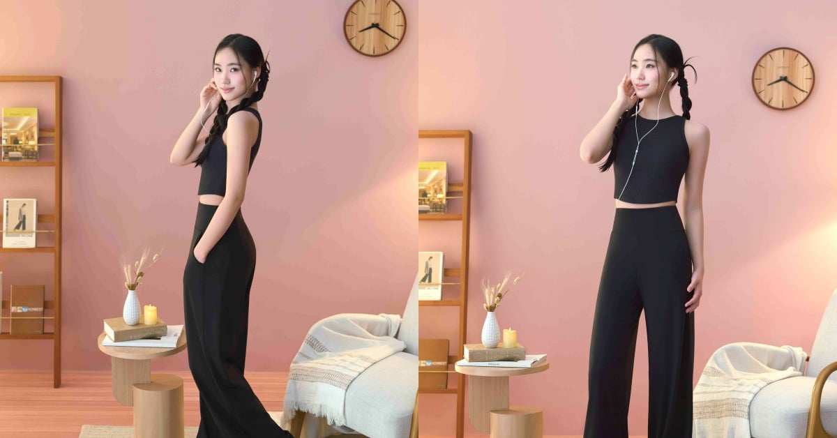 回到居家空間後,Lily 換上 休閒寬褲搭配圓領短版背心,展現完全不同的輕鬆氛圍。高腰收腹的寬褲能自然修飾比例,再加上微落地褲長,整個人瞬間變得纖長俐落。短版背心讓肩頸線條更明顯,簡單卻充滿女孩的日常魅力。