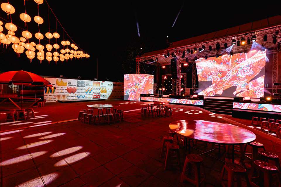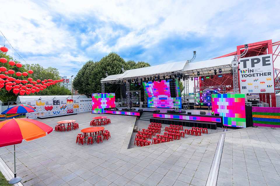 不敢相信!在法國巴黎竟然也能看到臺式廟會辦桌的熱鬧場面!這次的臺灣文化館的舞台設計,特別以廟會、喜宴為靈感,打造變形金剛「電子花車」半露天舞台,由紅、綠、藍、粉紅四種顏色組成,白天是廟宇的線條設計,晚上則變成絢麗奪目的舞台,為了重現辦桌時的熱鬧氛圍,臺下還特別放了喜慶會出現的紅色大圓桌、紅板凳,並掛上喜氣的紅燈籠,彷彿回到小時候跟著爺爺奶奶在廟口看熱鬧的情境。在場館的設計還驚喜藏了小巧思,只要臺灣選手於運動競技場上獲勝時,現場的「報喜」機關就會播放特殊影像與燈光特效,為臺灣奧運選手們喝采喔!