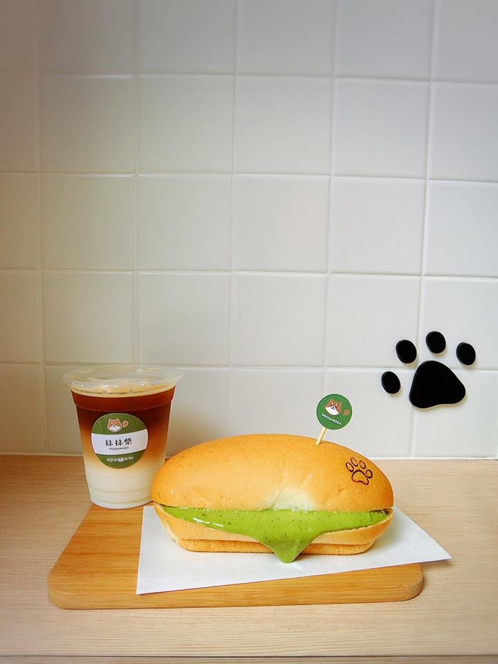再來就是柴犬控必仿的「抹抹柴」早午餐囉!整間店面到處都是萌萌的柴不說,招牌餐包、抹茶冰上頭都有可愛的腳掌印,且logo也是柴柴圖案,說有多療癒就有多療癒~另外門口還有一台自動販賣機,可選購抹茶或焙茶。