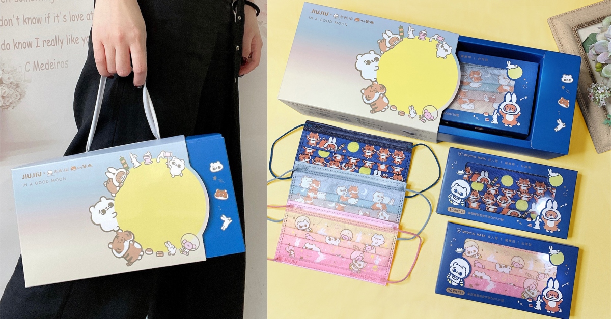 今年過中秋節,無論烤肉、賞月還是親友相聚,口罩是最必要的配件,送上「親親JIUJIU中秋禮盒組」一次擁有三款花色CP值最高!每一款印花都好有戲,搭配日常衣著更是時髦加分!讓爽爽貓與小勞撫陪伴大家過一個溫馨又開心的中秋佳節吧!