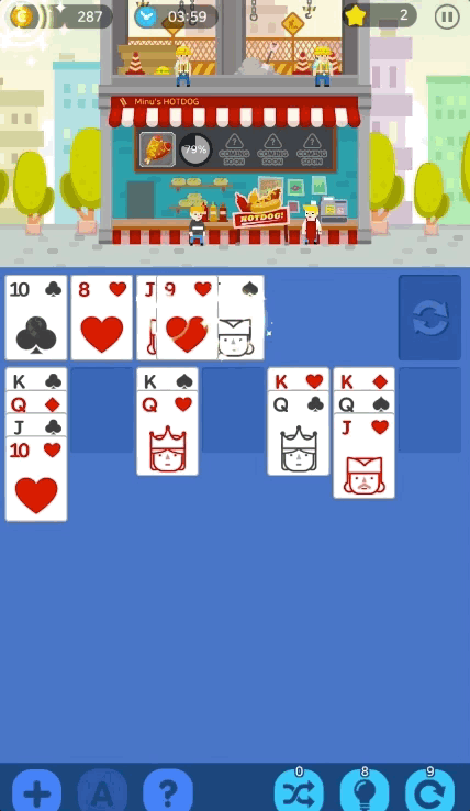 《Solitaire Cooking Tower》是以卡牌遊戲接龍為背景的手遊,遊戲的上方是玩家用牌技所蓋出來的餐廳,下方則是牌局。當玩家在打牌的時候,上方的餐廳也會開始建造工程,只要打得一手好牌,就能蓋出跟影片一樣的繁華餐廳塔!