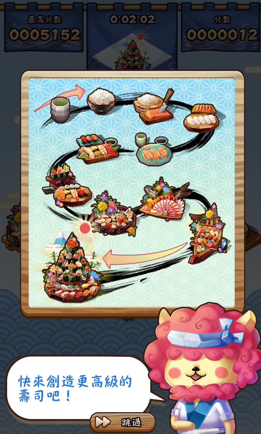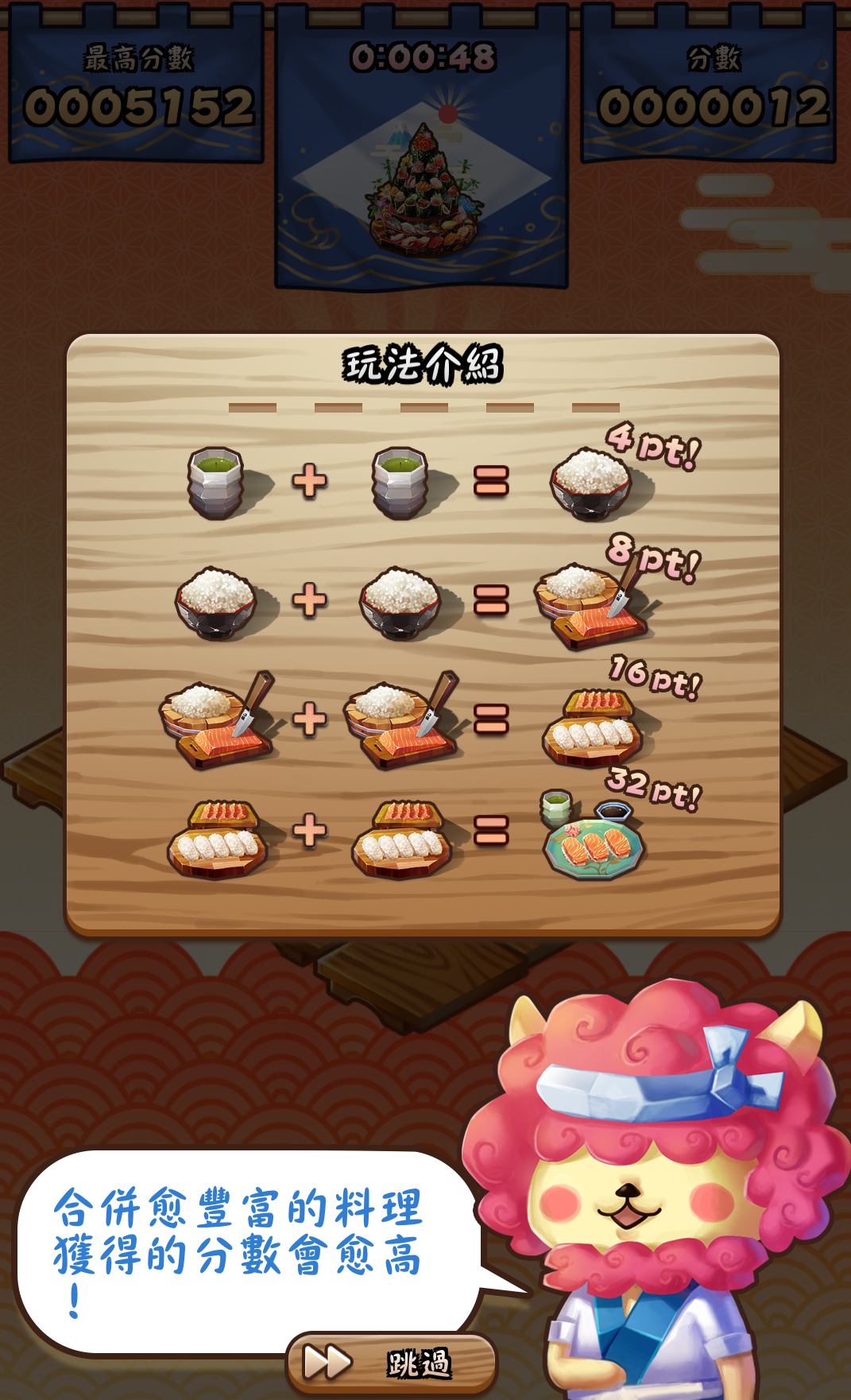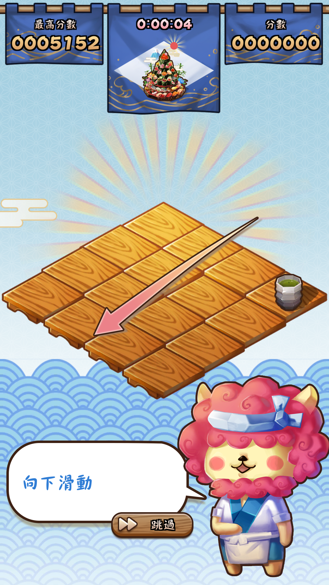 第一次進入遊戲時,會有一隻毛髮旺盛的獅子(?)壽司師傅帶你進行遊戲教學。遊戲方式很簡單,跟前陣子流行的2048一樣,上下左右滑動操控所有沾板上壽司的移動,讓兩個相同種類的壽司撞擊在一起,就會產生一個新的升階版壽司!