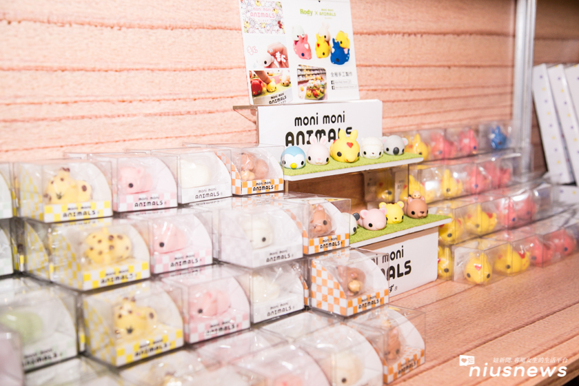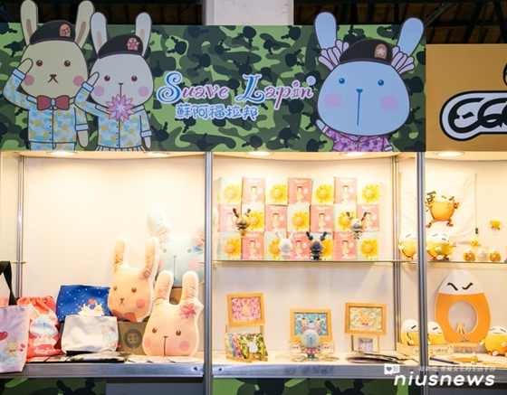 這個展攤也是妞編輯個人覺得很亮眼,一走近就會覺得少女心大爆發的區域,是台灣設計師團隊「 蘇阿福拉邦」的作品,主角是一隻帶著小花的粉紅兔兔,讓人看了好想她們全部抱緊處理啊!(現場還可以玩日式的抽抽樂喔!)