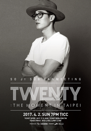在今年,蘇志燮也將跨入不惑的人生階段,好一段時間沒有舉行過見面會的他,於此重要的時期,也希望能與長久支持自己的「蘇太太們」共同寫下紀念的時刻,日前便宣佈20週年亞洲巡迴見面會《 TWENTY : THE MOMENT 》即將開跑,而這具備特殊意義的重要里程碑,當然不會漏了先前已經帶給他許多感動的「台灣」,台灣蘇太太們都期盼許久的台灣見面會《 SO JI SUB FANMEETING TWENTY : THE MOMENT IN TAIPEI 》也終於將在2017年4月2日星期日晚上7點於台北國際會議中心大會堂(TICC)舉辦,當天也將贈送給全場購票參與的蘇太太們20週年台灣場專屬紀念”發光手環”及”特製馬卡龍”,也希望蘇太太們在這特別的20週年台灣見面會當晚,都能與蘇志燮一起創造一個難忘的美好回憶!