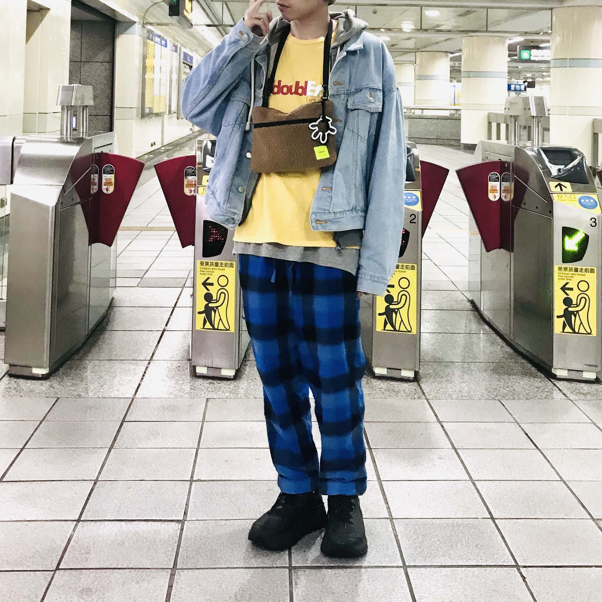 因為是素面髮帶,所以上下身建議搭配較鮮豔的顏色或花色。女孩想試試稍微boy風格的樣子,很可以參考這套的穿搭:一衛衣+格紋褲,再穿oversize外套(可偷男友或哥哥或爸爸或弟弟的)