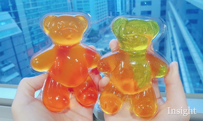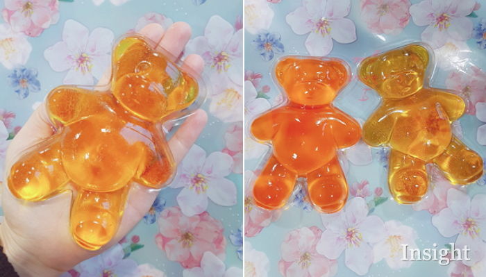 共分為橘子口味的男生熊跟鳳梨口味的女生熊兩款,打開包裝的瞬間,甜蜜的水果香氣就飄出來了~不忍心咬下第一口的超可愛外表,不如讓相機先吃吧!價錢雖然只賣1800韓元,但是一個卡路里就飆到510大卡,讓韓國網友大呼:「這熱量是真實的嗎?」(吃一隻就比嗑掉一個便當還高了XD)