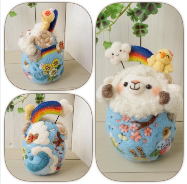 這款綿羊不倒翁,頭上插著別緻的彩虹,身上還有獨特的花樣,讓綿羊羊毛氈更顯得獨一無二。