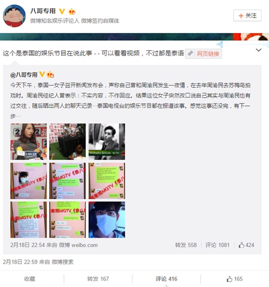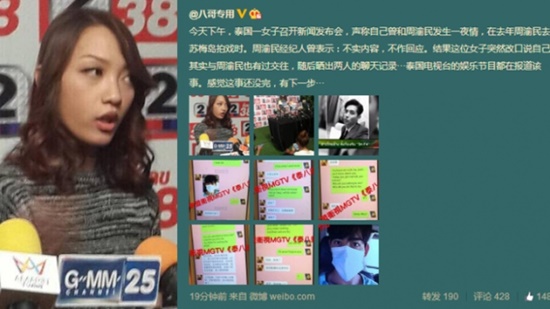 周渝民經理人曾表示:『不實內容,不作回應。』結果這位女子突然改口說自己其實與周渝民也有過交往,隨後曬出兩人的聊天記錄···泰國電視台的娛樂節目都在報導該事。」