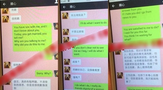 聊天內容寫道:今日,你結婚,你有告訴我嗎?為甚麼要對我說?為甚麼要這樣對我。」對方則說:「語言,真的有點問題,不清楚妳的意思,但是我很抱歉傷害妳語意曖昧,讓人懷疑是真是假。