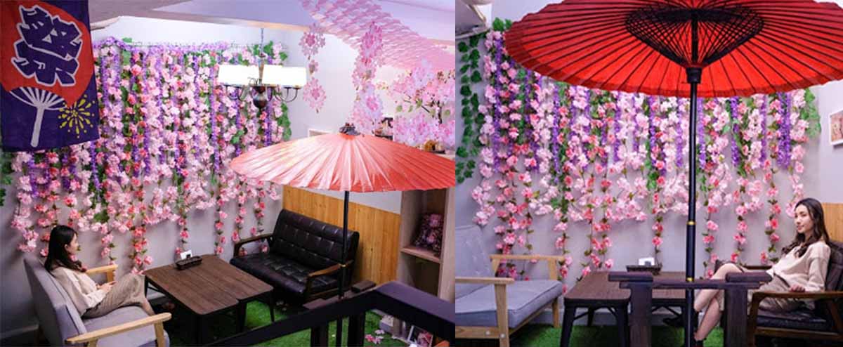 地下室一樓兩桌的座位空間以花牆和日式紙傘佈置,充滿日本味,像極了在漫畫裡面會出現的場景。