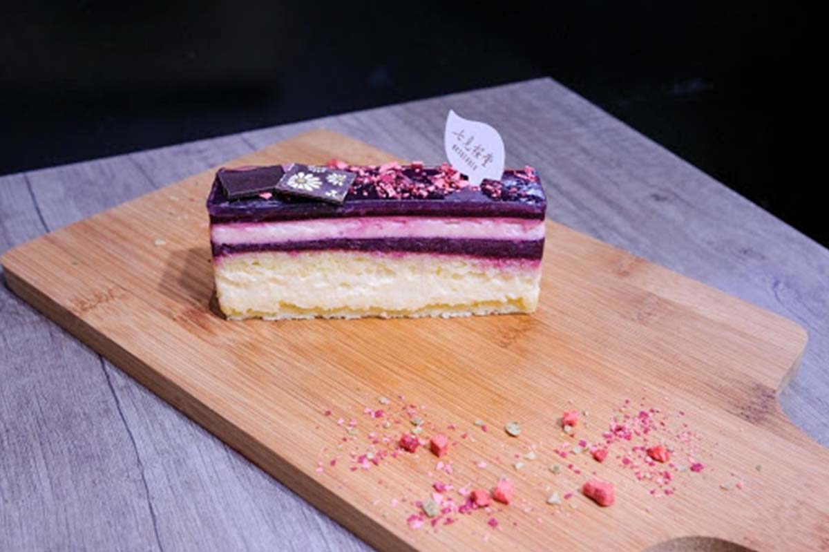 兩層手工製作的黑莓凍,加上兩層Mascarpone Cheese乳酪起司加上白巧克力製成的慕斯,還有雙層海綿蛋糕,層層相疊。微酸的黑莓搭配濃郁的起司慕斯,酸甜酸甜的滋味非常融洽,蛋糕搭配慕斯後口感濕潤綿密,味道具有層次感,忍不住一口接著一口。
