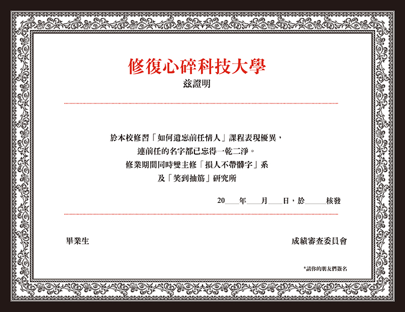 經過上面的儀式,如果妳過程中還是完全笑不出來,那麼請重新再來一遍;但是如果妳心底變得如釋重負了,那麼恭喜,妳已經準備好從失戀中畢業啦!