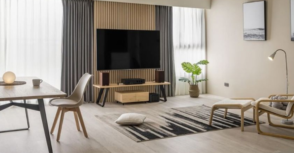 無印風基本上除了主色彩之外,另外搭配的色調也只用淺色色系做輔助,給人視覺上很一致的感覺。收納也能利用電視櫃的空間作設計,放置電器用品以及遙控器等等的物品,讓整體空間更有組織性。