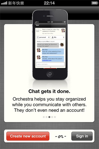 第一次使用程式,會有一些系統的介紹,Orchestra是需要申請帳號才能使用的,你可能會覺得奇怪,為什麼一個待辦事項軟體需要申請帳號呢?