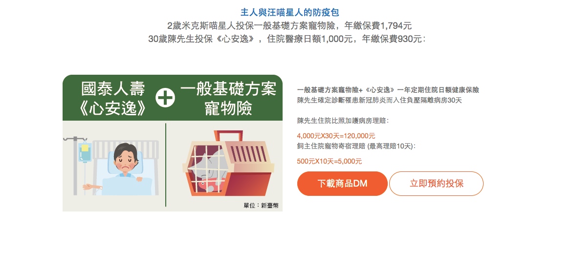 國泰產險的《寵物綜合保險》目前是市佔率前三名的寵物險,加上最近「國泰人壽」推出因應新冠肺炎的《心安逸》,飼主可以與一般基礎方案的《寵物綜合保險》做搭配,假設飼主確診新冠肺炎而入住負壓隔離病房30天,比照加護病房理賠金額4,000元×30天;寵物寄宿理賠金額為500元×10天,不論是毛主人還是毛小孩都可以獲得相對應理賠金額!