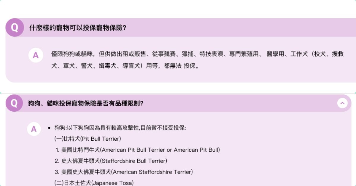 *具攻擊性之犬種、繁殖犬、工作犬等目前暫不接受投保;寵物如需安樂死有理賠;若寵物本身已有寵物保險無法再投保。