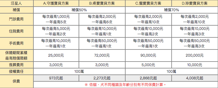 *年齡限制區間比較小、方案一沒有提供喪葬費用的補償、危險性犬隻無法承保,超過30公斤以上寵物不得承保。
