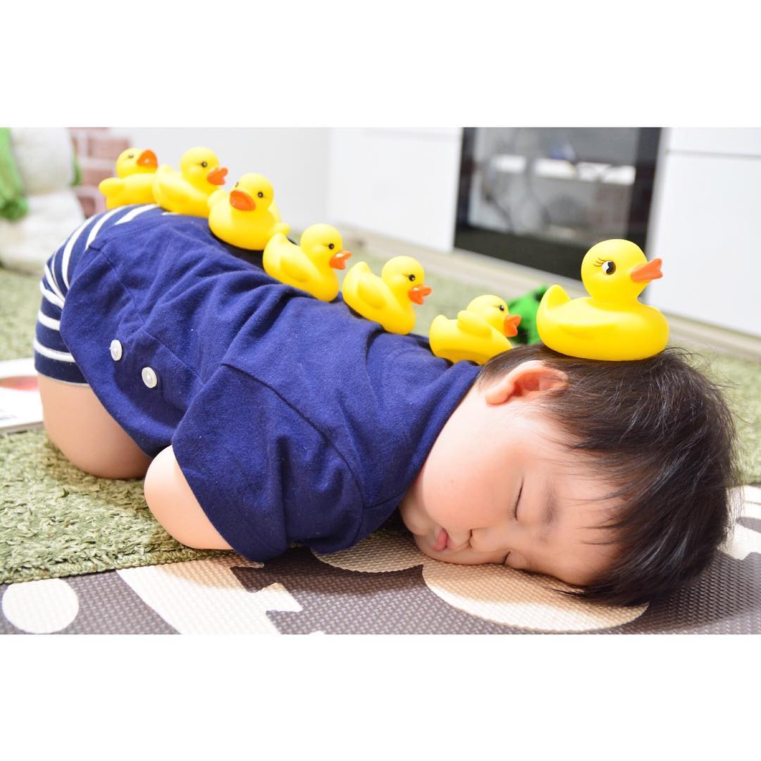 駿太熟睡的臉龐搭上的是...........三隻橡皮鴨+原子小金剛頭!