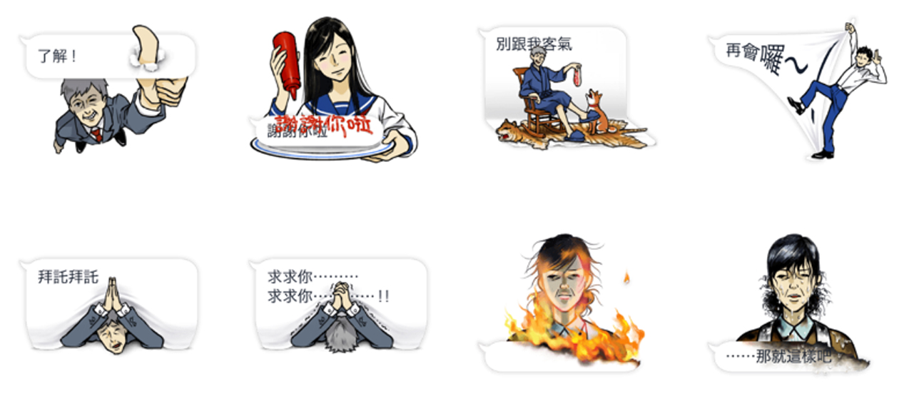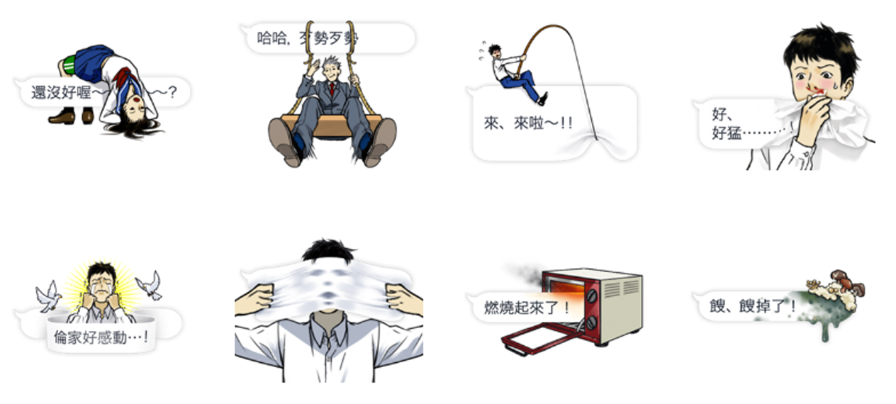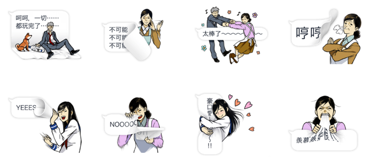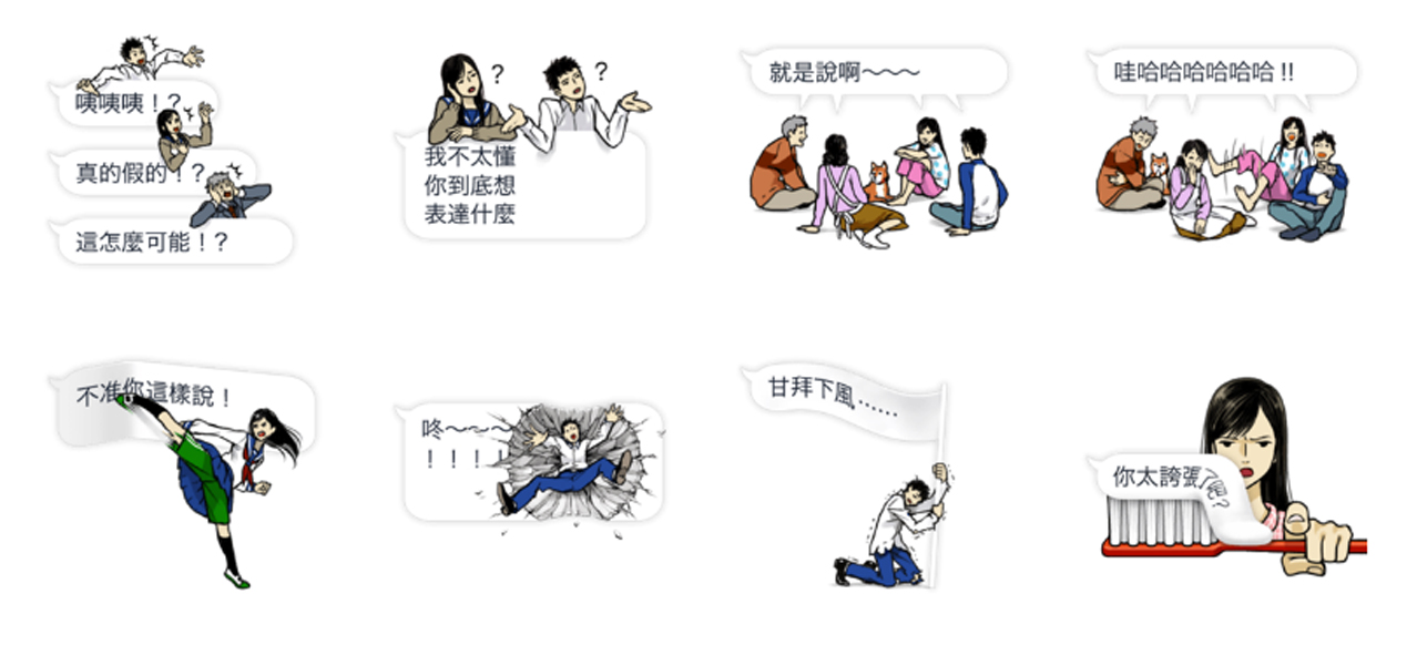 現在貼圖越來越多元,有聲、動態、全螢幕貼圖通通有,現在還多了「對話框」貼圖,不僅節省了打字的時間,有趣的圖案也能使對方會心一笑。有趣的一家人《吹出這一家》惡搞各種對話框,或揍或踹或吃樣樣來,一家四口配上一隻柴柴既溫馨又促咪!