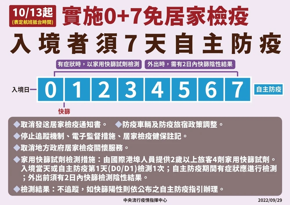 台灣政府也宣佈自10/13起回國實施「0+7」防疫政策,也就是指0天的隔離加7天的自主防疫,入境當天或自主防疫第一天需進行快篩檢測1次,防疫期間外出前則必須要有2日內的快篩陰性結果,詳細的規範可以參考衛福部提供的「自主防疫期間之詳細規範」!