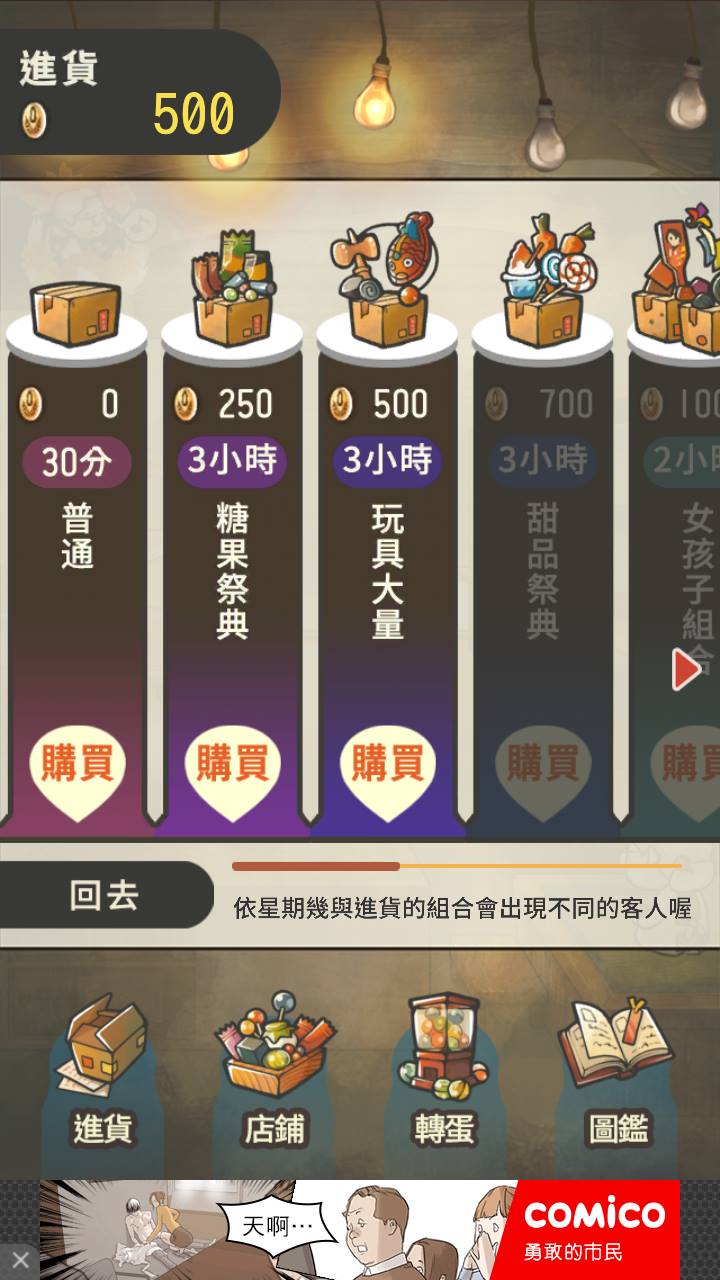 進貨的商品包括糖果、零食、玩具等等,還可以強化店內設備喔。