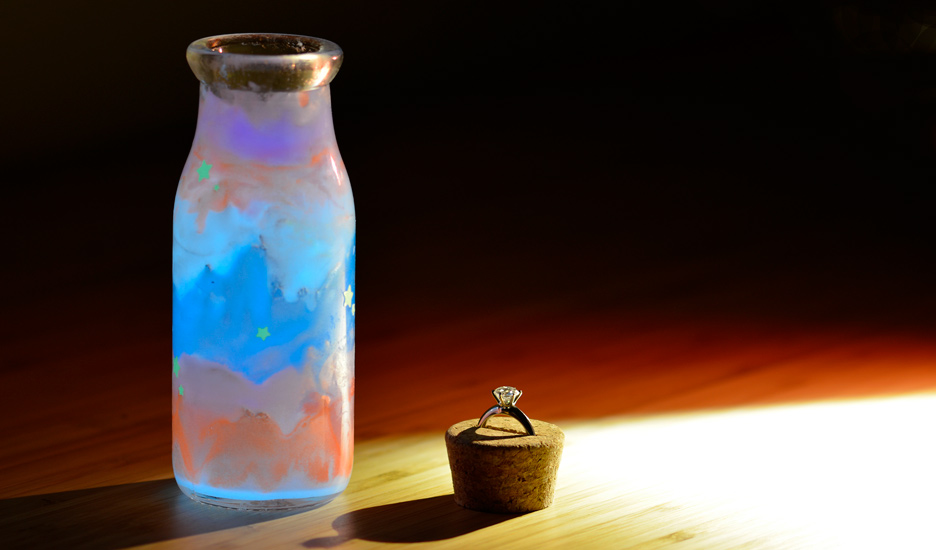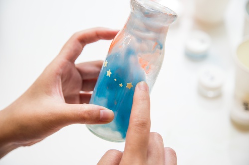想要體驗將滿天星空裝進瓶子裡的感覺嗎?手繪星空瓶可以滿足你的夢幻想像~星空瓶的製作原理是使用夜光粉,因夜光粉可以產生夜光效果,普遍用於緊急逃生的入口標誌和釣魚的浮標上。想到將原本化工材料行裡販賣的原料拿來當成DIY的課程製作,真的非常有創意呢!