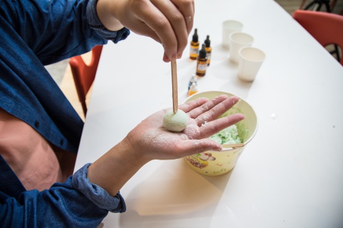 加入喜歡的精油味道。現場提供了尤加利樹、薰衣草、香茅三種味道,這三種精油都具有提振精神、舒緩的效果。