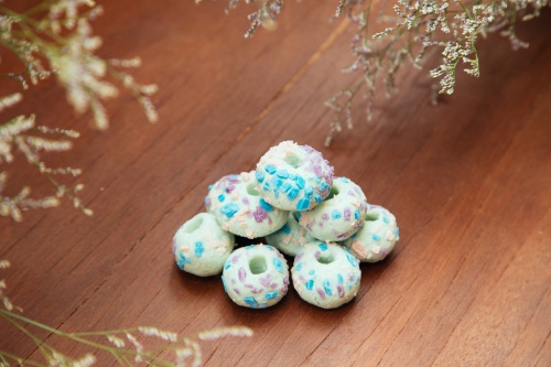 捏一小塊起來,像搓湯圓的方式把它搓圓,再用吸管插洞。最後放上已經弄碎的肥皂顆粒裝飾。