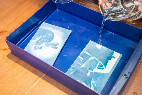 曬完後再放入盆子裡用水洗一洗。先將照片放入盆子底部再加水,水不要直接淋在照片上喔,會把剩餘的感光液沖掉,稍微搖晃一下盆子過個水即可。最後用廚房紙巾壓乾就完成了~