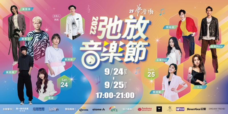 每年都吸引大批粉絲參加的弛放音樂節,今年卡司陣容全面大升級,統一時代百貨力邀10位名人歌手輪番開唱,活動首日9/24將由剛推出新專輯的曾沛慈領先開唱,以及黃奕儒、黃霆睿、琳誼接續演唱,並由正在進行北中南巡迴演唱會的蕭秉治擔任首日壓軸,活動第二天9/25則由顏佑庭開場、九九、柏霖PoLin、法蘭Fran及最後壓軸的關詩敏帶來精彩的好歌,活動兩天熱烈開唱,每天從下午17點開始,一路陪歌迷唱到21點。
