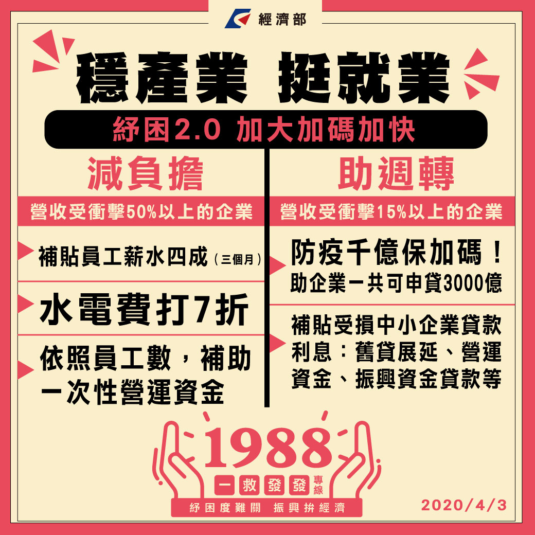 而經濟部就對於電費、水費以及稅務等等做了補貼計畫,首先是要減輕企業負擔,營收受衝擊的企業將會補貼每位員工薪水的4成,並且依照員工數,補助一次性營運資金,另外水電費還可以打7折。中小企業若需週轉,可向銀行申貸最高3000億元,並補貼貸款利息。