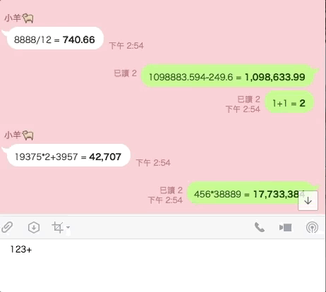 要體驗這個功能請先將LINE更新,更新之後,在對話框輸入算式之後,LINE就會自動幫你算出答案,速度超快,而且有遵循「先乘除後加減」的規則,答案絕對正確。(比手機小姐還聰明哈哈哈)