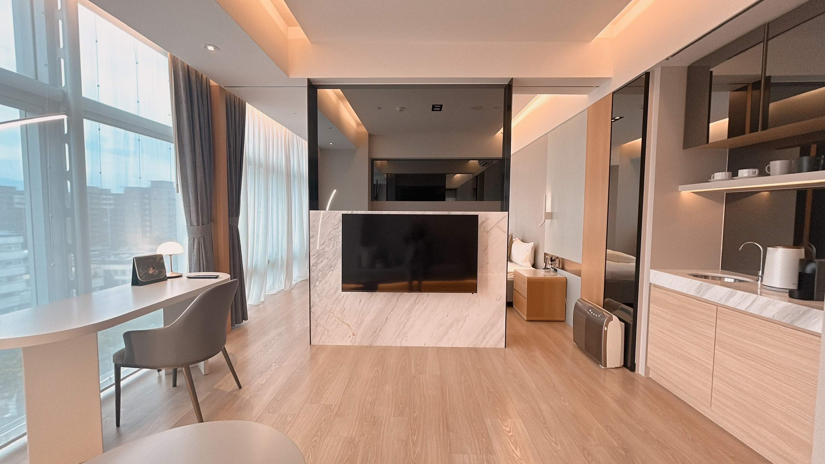 館內整體氛圍自然放鬆且優雅溫暖,空間通透感十足,位在空間中央的育嬰室,不論是入住媽咪或是來訪賓客,都可以在半身式的玻璃窗前與寶貝進行親密對視,在房內也可以隨時透過我們的寶寶 APP 關注寶貝動態與成長紀錄。走入公共空間區域,映入眼簾的是可提供爸爸處理公事或休憩的多功能空間,在諾大的空間中能隨時將半透明玻璃遙控轉成霧面,讓爸爸陪伴媽咪、寶寶的同時也能擁有靜謐的工作時光;