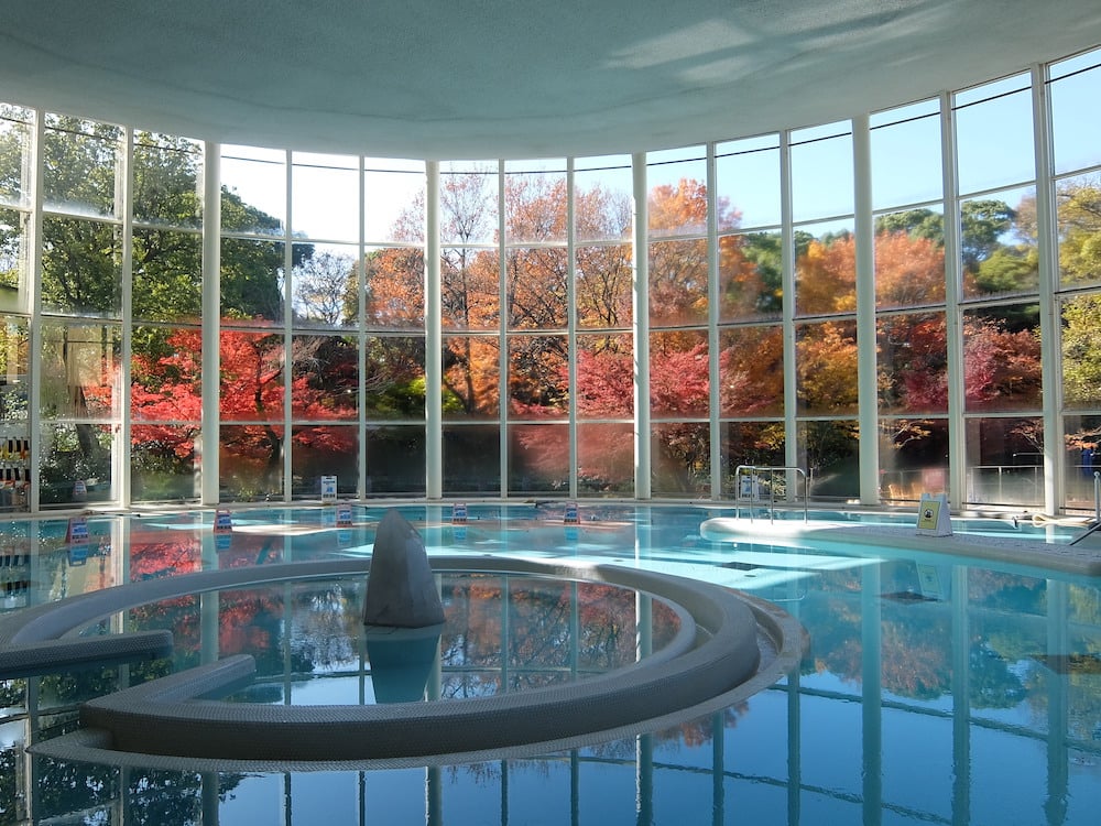 溫浴水池的水溫接近正常人體體溫(約35℃),對人體較無負擔;池畔設有按摩水柱,可以拯救痠痛頂叩叩的肩頸。水池區與溫泉區可互通,但由於溫浴水池是男女混合區域,進入前必須先換上泳裝喔!