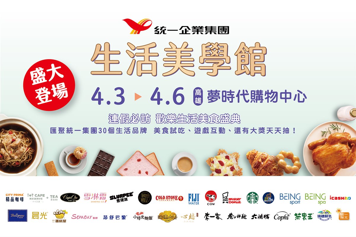 連假必訪的「統一集團生活美學館」又要來囉!4月3日至6日,最歡樂的生活美食展將再 度於高雄夢時代購物中心8F時代會館盛大登場。今年活動規模又全面升級了,匯聚30個人氣 品牌,帶來限定優惠、美食試吃與驚喜滿額禮,讓你吃得開心、買得盡興!此外,來展的每人只 要單筆消費滿129元,就可以加碼兌換生活好禮;累積消費滿299元還有機會抽中萬元禮券, 每天都會抽出一名幸運得主!更貼心的是,現場還有宅配到府的寄送服務,讓你輕鬆購物、無負 擔帶回滿滿好物。