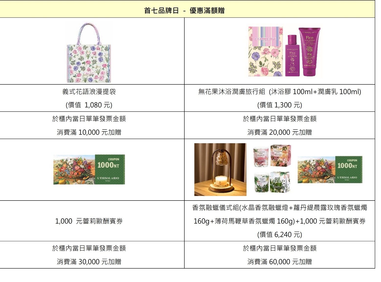 掌握好命感的關鍵三是打造肌膚「透明感」!即便不上妝,也能臉上有光!百貨週年慶蕾莉歐祭出多重強檔優惠活動,不僅開打首七日滿額好禮享不完,更精選3大打造「透明肌」必備的TOP明星保養組,週年慶期間全面低至6折,首七日再贈千元保養好禮!週年慶首七日凡於櫃內當⽇單筆發票⾦額消費滿5,000元送700元;消費滿10,000元加贈「義式花語浪漫提袋」乙只;消費滿20,000元加贈「無花果沐浴潤膚旅⾏組(沐浴膠100ml+潤膚乳100ml)」乙組;消費滿30,000元加贈「1,000元蕾莉歐酬賓券」乙張;消費滿60,000元則加贈「香氛融蠟儀式組(⽔晶香氛融蠟燈+蘿丹緹晨露玫瑰香氛蠟燭160g+薄荷⾺鞭草香氛蠟燭160g」與「1,000元蕾莉歐酬賓券」乙張。