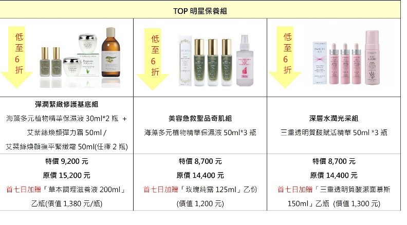 三大「透明肌」必備TOP明星保養組,首先是熱銷TOP 1的彈潤緊緻修護基底組,包含「海藻多元植物精華保濕液30ml」2瓶、「艾棻絲煥顏彈⼒霜50ml /艾棻絲煥顏撫平緊緻霜50ml」任擇2瓶,特價9,200元,修護肌膚同時,讓肌膚由內而外澎、潤、彈,⾸七⽇再加贈「草本調理滋養液200ml」乙瓶;TOP 2的美容急救聖品奇肌組,包含「海藻多元植物精華保濕液50ml」3瓶特價8,700元,一滴就讓疲憊肌恢復彈性與飽滿,留住肌膚好氣色,⾸七⽇加贈「玫瑰純露125ml」乙份;TOP3的深層⽔潤光采組,包含「三重透明質酸賦活精華50ml」3瓶特價8,700元,一瓶完成肌膚保濕鎖水、強化屏障、緊緻撫紋,⾸七⽇加贈「三重透明質酸潔⾯慕斯150ml」乙瓶,從清潔到保養一次到位,輕鬆養出發光「好命肌」,讓你買得聰明、美得毫不費力!