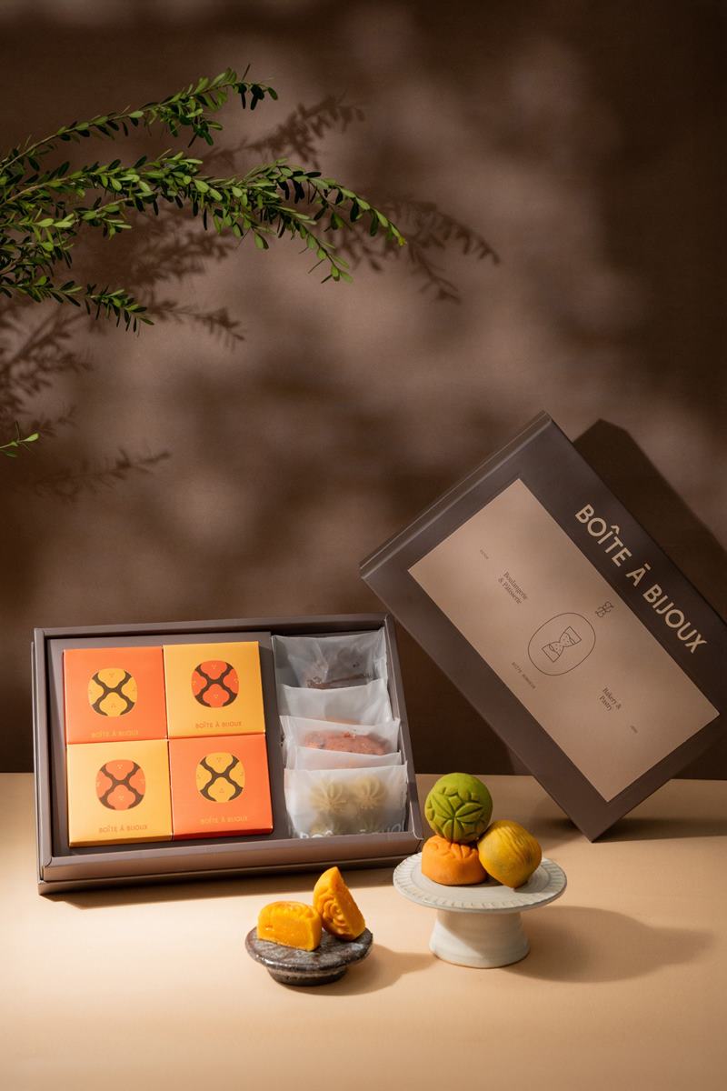 中秋送禮首選的月餅禮盒,珠寶盒以台灣舊時零嘴盒(台語發音”四秀仔”或”四獸仔”)四格分裝不同零食的概念發想,獻上烏魚子奶黃、栗子焦糖、蜂蜜柑橘、奶黃流心四種口味,以細緻不油膩的手工日式桃山皮包覆,佳節傳遞「賜壽」吉祥寓意。延續品牌支持在地優質小農的理念,「烏魚子奶黃」口味選用雲林口湖鄉養殖烏魚子,取得最佳口感成熟度的魚卵,職人鹽漬、日曬壓製,烏魚子鹹鮮醇厚結合奶黃濃香,每口都是充滿溫度的台灣風土情感;「栗子焦糖」法國栗子溫醇栗香融合手工熬煮焦糖的濃郁苦甜,展現金色秋意;「蜂蜜柑橘」添加義大利進口橘皮丁增添清新香氣,明亮酸香尾韻清甜,「奶黃流心」內餡加入奶油凝結鹹蛋黃的濃郁香醇,奶香誘人鹹甜交織,每一種口味皆展現均衡不膩口的甜度。