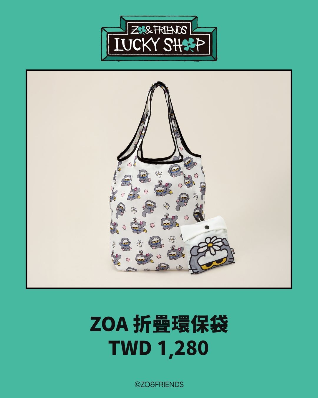 不只可愛,還很實用!購物袋展開來是滿版的ZOA圖案,搭配時髦黑白配色,容量也很可以,不管是日常要購物、當隨身包都行,不用的時候還可以收納起來掛在包包上。每人每款限購 3 個