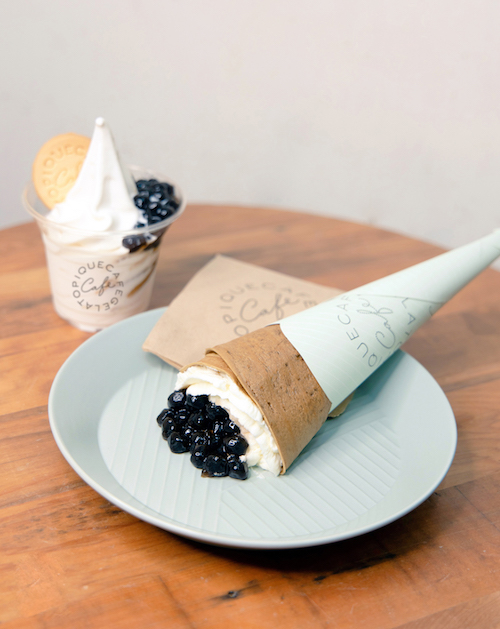 還有「珍珠奶茶可麗餅」,也是以有著濃郁伯爵茶香的餅皮,配上Q彈黑糖珍珠,再抹上手工製的奶油白醬,嚐起來清爽美味。如果想吃更原始的滋味,也可以點選「伯爵奶茶可麗餅」,以gelato pique café獨家開發的伯爵奶茶餅皮、灑上黑糖粉,能吃到最簡單純粹的好滋味。