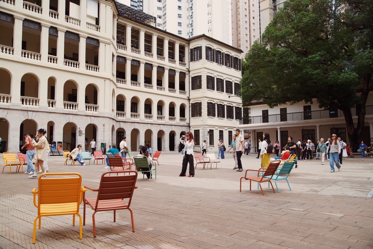 這座擁有超過 180 年歷史的建築群,原是前中區警署、法院與監獄所在地。經歷十年修復活化,現在的大館是香港最具代表性的文化地標之一。從紅磚外牆、鐵窗走廊,到當代美術館「賽馬會藝方(JC Contemporary)」的銀灰鋁磚建築,新舊並存的畫面就是大館最迷人的靈魂。遊客在不同區域能感受到截然不同的氛圍。前區輕鬆悠閒、監獄區帶著歷史沉重、當代展館則充滿藝術能量。