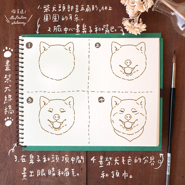 先來認識柴柴的特徵!柴犬的頭型大致上成圓圓五角形,耳朵是短短的三角型,畫好頭型輪廓後,在臉部的正中間畫上鼻子,接著畫出舌頭和嘴巴。眼睛的位置在頭頂和鼻子的中間,記得畫出閉眼細細的睫毛!最後畫出毛色的邊界和領巾。