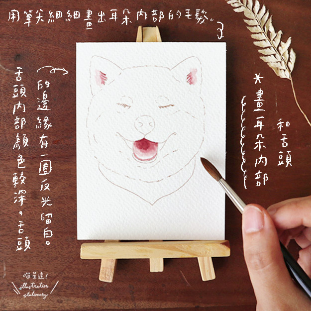 用桃紅色和褐色調和出動物的肉色,用筆尖畫出耳朵細細的毛髮,接著為舌頭上色,舌頭的內部顏色較深,在外面邊緣處有一圈反光留白,會讓舌頭看起來更立體!