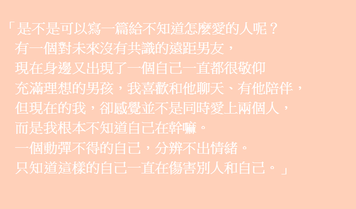 因為篇幅限制,妞編輯僅擷取蕭詒徽回覆中的一小段落,若想詳細看每一則全文,就請妞妞們自行去閱讀唷!裡面的匿名者有男孩有女孩,請教的方面包含愛情、親情、友情和工作等等。