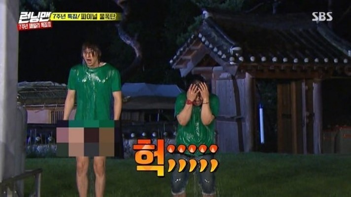 而慢半拍的李光洙成為一起接受懲罰的組別(果然是臭手光洙),結果,在接受水炸彈時,李光洙的褲子又、掉、了!妞編輯覺得除了是拔蘿蔔遊戲的後遺症之外,應該也跟李光洙沒有屁股、實在太纖瘦應該有關吧!