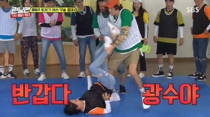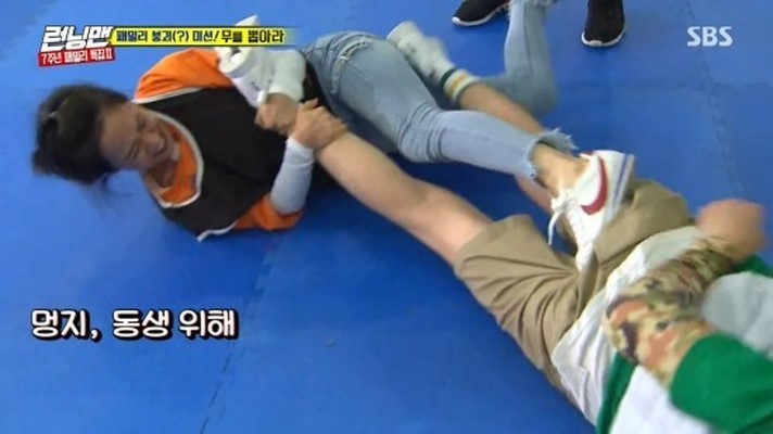 最後太可愛(光洙好友太恆浩)把宋智孝拉出墊子外時,宋智孝還抓著李光洙的頭髮,一起拽出墊子。