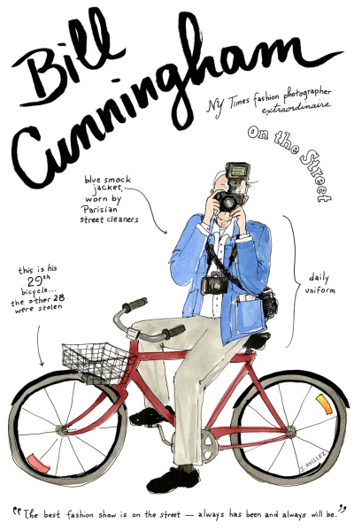 Bill Cunningham每次出去街拍一定會準備三樣東西,那就是藍色夾克外套、相機,以及騎一台超過三十年的老舊腳踏車,他說過他認為的時尚秀是來自於街頭「最常被看見,也總是會在那裡!」