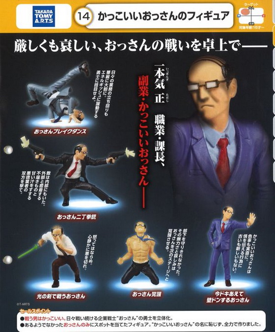 「帥大叔(かっこいいおっさんのフィギュア)」系列扭蛋,共有5種不同帥氣狀態的大叔。(擅長跳霹靂舞的大叔怎麼回事?)。以「大叔」為題材,希望喚起大家對大叔的重視,畢竟總是全力以赴一戰的大叔,可是支撐著家庭、公司的超級戰士啊!(看更多)