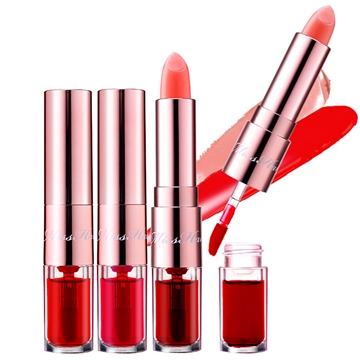 2017年的開春,Miss Hana花娜小姐為了滿足女性喜歡多變嘗鮮的願望跳脫傳統唇彩的方式,推出雙頭持久唇露豐潤唇膏其雙頭的設計一邊是漸變唇膏一邊是保濕染唇露,具有雙重功能,輕鬆打造迷人的功效。三種玩唇方式:Way 1-單擦漸變唇膏,運用唇膏會隨著體溫做變化,量身打造專屬的唇色,其含有滋潤度極高的蜂蠟,可以舒緩乾裂的雙唇遮蓋暗沉唇色,撫平唇紋;維他命E可以創造唇部的飽滿度。Way 2-單擦保濕染唇露,含有新型的鎖水科技,就算只是單擦也可以維持水亮的光澤感一整天,同時亦可以當作腮紅使用,其斜角的彈力刷頭可以描繪出立體豐唇。Way 3–使用唇露打底再加上唇膏上色,輕輕一抹呈現完美持久立體光水晶唇。Way 4–將三種不同顏色的豐潤唇膏任意搭配。