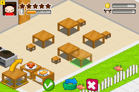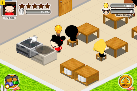 左上角的頭像就是老闆,預設頭像都是可愛的Pucca!星星表示了你餐廳的等級,會隨著客人的心情還有做菜所收集的星星而改變,最高就是五星級餐廳啦!下方的經驗值是以廚師高帽來表示。